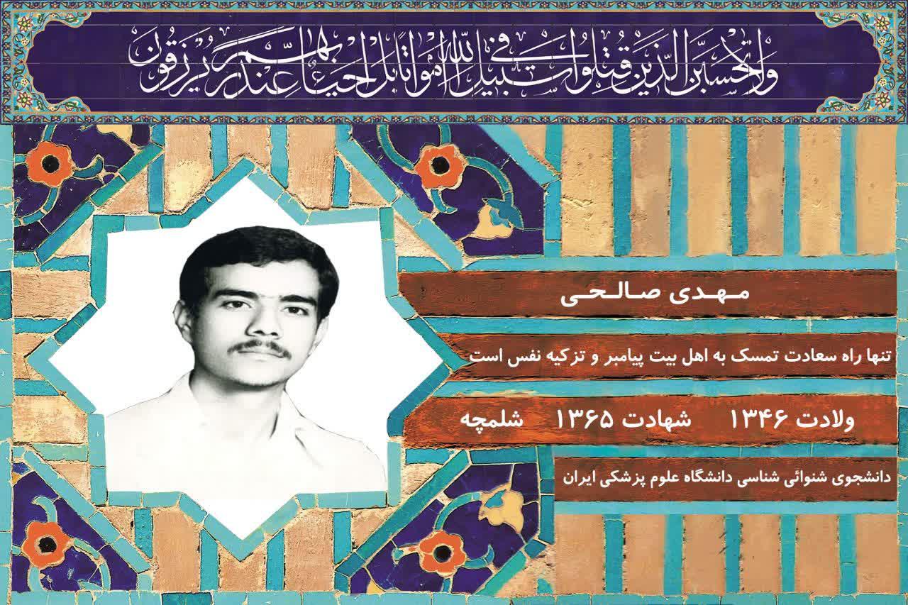 شهید مهدی صالحی روز پنجم اسفندماه سال1346 در روستای نوده از توابع شهرستان فردوس در استان خراسان دیده به جهان گشود. دوران کودکی خود را در همان روستا و در آغوش گرم خانوادهای مذهبی و مستضعف پشت سر گذاشت. در سال 1353 وارد دبستان شد. در این دوران ضمن فراگیری علم و دانش به مسائل عبادی و آموختن قرآن در مسجد محل پرداخت. دورة راهنمایی تحصیلی را در سال 1358 آغاز نمود. وی در این مقطع تحصیلی در پیشرفت علمی، ایمانی و تقوا یکی از بهترین شاگردان به شمار میرفت. از خصوصیات اخلاقی بارز در زندگیاش مظلومیت و عدم توجه به ظواهر بود. او در مدرسه به فعالیتهای فرهنگی پرداخت و در پایگاه بسیج و نماز جماعت مسجد محل حضور فعال داشت. در سال1364ـ سال چهارم دبیرستان ـ برای اولین بار داوطلبانه به مناطق جنگی اعزام شد و حدود 3 ماه در جبهههای غرب کشور به یاری رزمندگان اسلام شتافت. سرانجام پس از اخذ مدرک دیپلم در سال1364 در آزمون سراسری دانشگاه شرکت و در رشتة شنوایی سنجی دانشگاه علوم پزشکی ایران پذیرفته شد. پس از مدت کوتاهی تحصیل در دانشکده، مجدداً در سال 1365 به جبهههای جنوب اعزام و با شرکت در عملیات کربلای5 در منطقة شلمچه پس از دلاوری های فراوان در سوم بهمنماه سال 1365 به فیض شهادت نایل آمد.