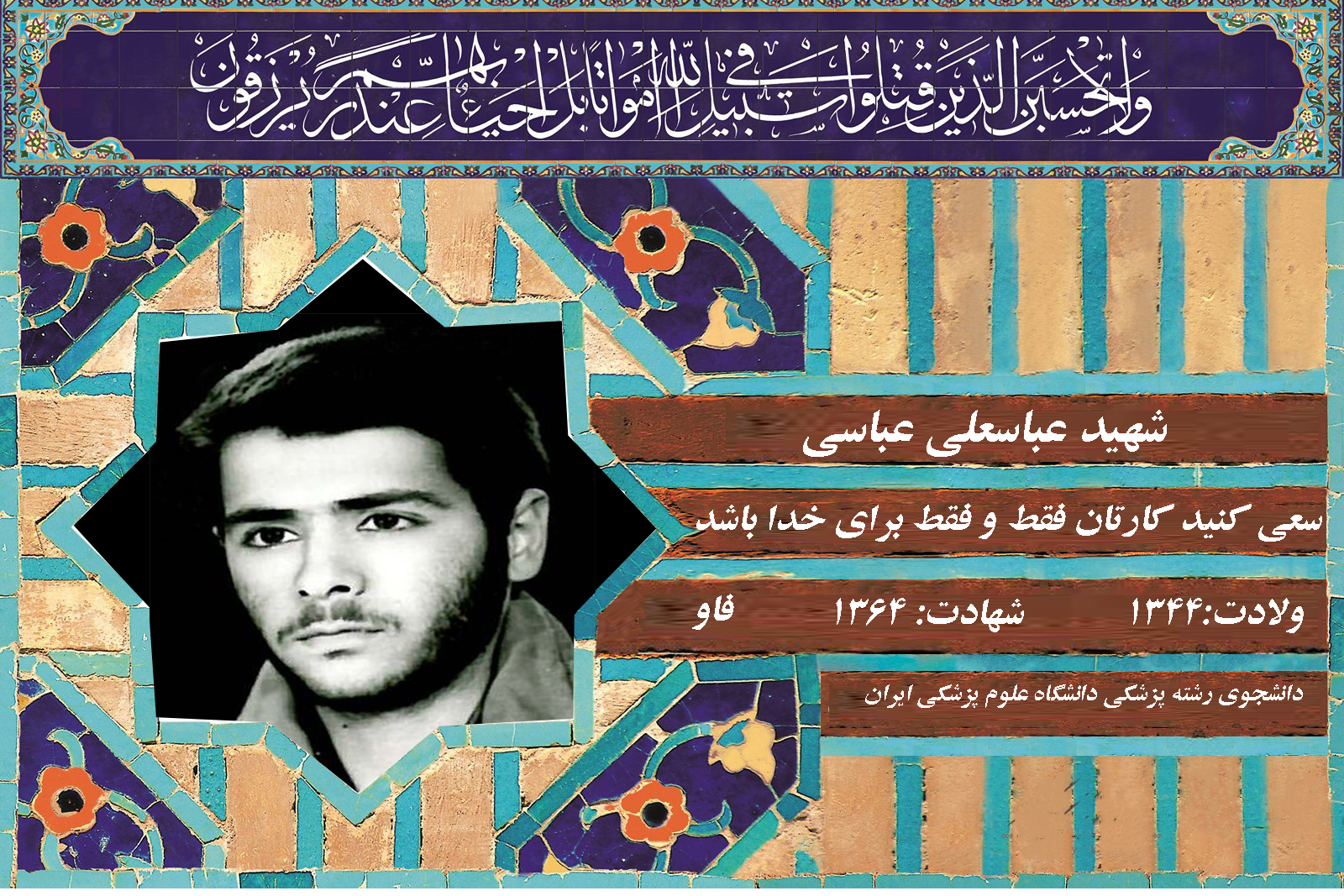 « بسم رب الشهداء والصدیقین» شهید عباسعلی عباسی پنجمین فرزند خانواده در فروردین ماه سال یک هزار و سیصد و چهل و چهار در خانوادهای مذهبی در یکی از روستاهای اطراف ساوه چشم به جهان گشود. وی از همان اوان کودکی به همراه خانوادهاش پس از عزیمت به شهرستان قم در مراسم مذهبی و عزاداریها شرکت میکرد و پس از آن به کمک پدرش به فراگیری قرآن کریم و نماز و مسائل دینی پرداخت. در سال1350 تحصیلات ابتدایی را آغاز نمود با توجه به هوش و ذکاوت کم نظیری که داشت دوره راهنمایی تحصیلی و سپس دوره تعلیمات عمومی را در رشته تجربی با موفقیت به پایان رسانید. پس از اخذ دیپلم در سال 1363 در رشته پزشکی دانشگاه علوم پزشکی و خدمات بهداشتی و درمانی ایران پذیرفته شد. آنگاه پس از مدت کوتاهی ادامه تحصیل در دانشگاه در تاریخ 64/10/25 به همراه اکیپ پزشکی به جبهه اعزام و سرانجام با شرکت در عملیات والفجر8 در منطقه فاو ( کنار اروند رود) در ساعت 12 ظهر روز 22 بهمن سال64 درحین کمک به مجروحین جنگ بر اثر اصابت ترکش راکت به درجه رفیع شهادت نایل آمد. « روحش شاد و راهش مستدام باد»